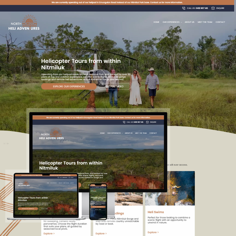 The website for North Horizon Heli Adventures was designed to promote premium helicopter tours and adventure experiences across the remote landscapes of the Northern Territory, particularly within Nitmiluk National Park. The platform highlights unique experiences such as scenic flights, cultural landings, waterfall swims, and heli-fishing adventures while showcasing the region’s natural beauty and Aboriginal cultural heritage. The goal was to create an engaging website that inspires travelers, clearly presents tour options, and encourages visitors to book unforgettable helicopter adventures.