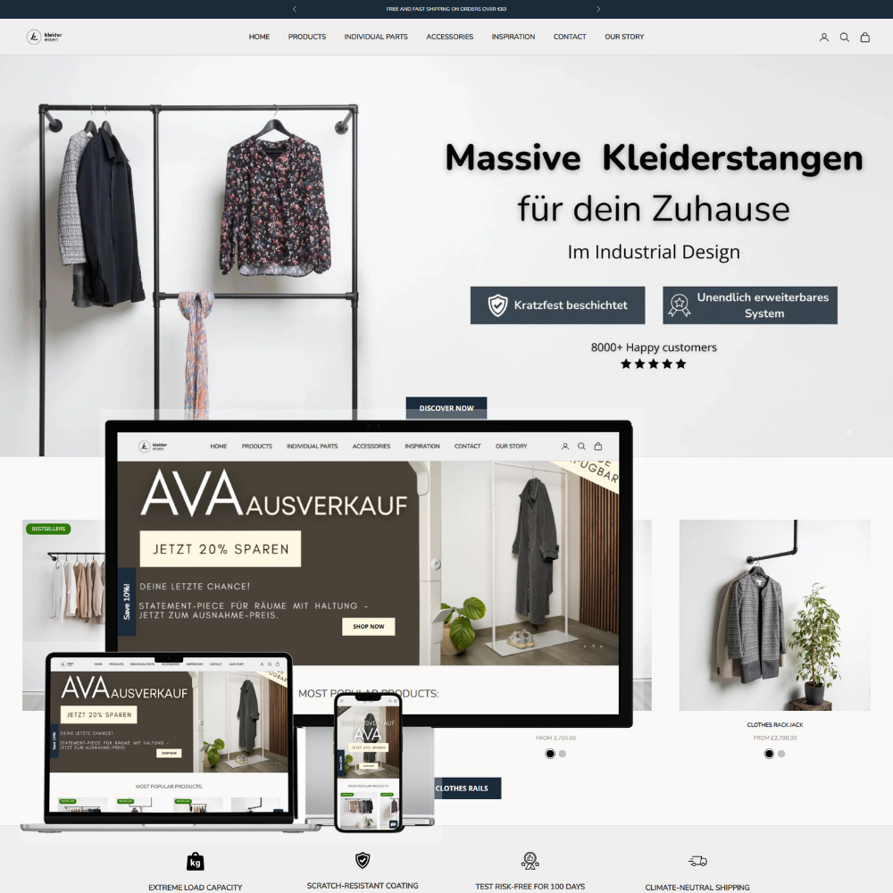The website of Kleidereisen is an e-commerce platform focused on selling industrial-style clothing racks and modular wardrobe systems made from durable iron pipes. The brand emphasizes minimalist design, durability, and customizable storage solutions for modern homes. The goal of the website is to showcase the products clearly, simplify the shopping process, and provide customers with flexible wardrobe solutions that fit different spaces and styles.