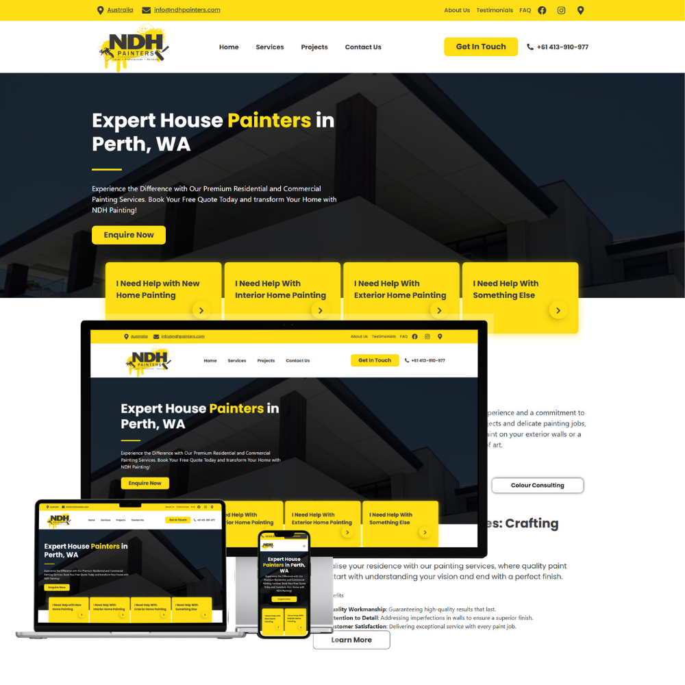 The website for NDH Painters was developed to promote professional residential and commercial painting services across Perth. The platform highlights services such as interior painting, exterior painting, spray painting, and colour consultation while showcasing completed projects and customer testimonials. The goal was to create a modern, trustworthy website that clearly presents services and encourages visitors to request a quote.