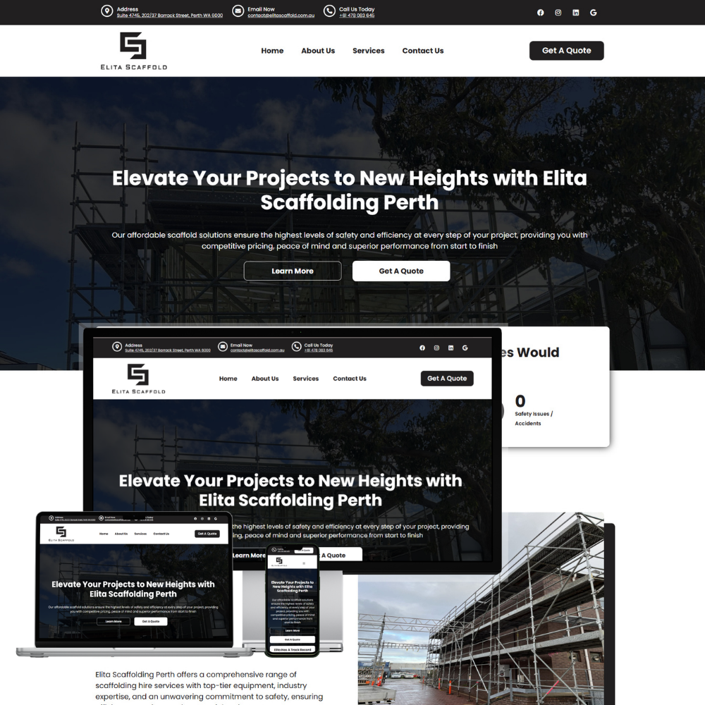 The website for Elita Scaffolding was developed to promote professional scaffolding hire and access solutions for residential, commercial, and industrial construction projects in Perth. The platform highlights a range of scaffolding systems such as steel and aluminium kwikstage, while emphasizing safety, reliability, and efficient project support. The goal of the website is to clearly present services, build trust with potential clients, and encourage project inquiries through quote requests.